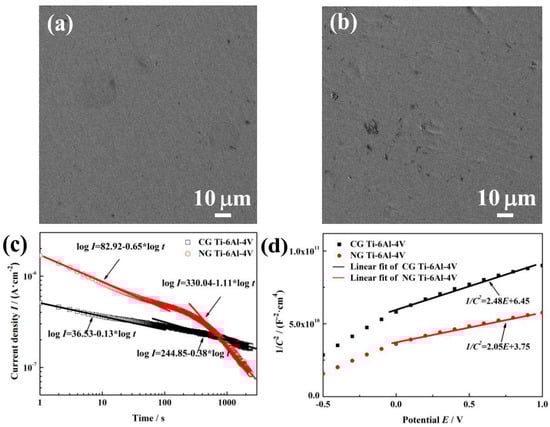 Figure 3a,b show SEM surface morphologies of NG and CG Ti–6Al–4V samples after polarization measurements. Both samples exhibit the similar electrochemical corrosion morphologies. The surfaces of NG and CG samples are all possibly covered by a passive layer without obvious pitting. In order to further understand the improved corrosion resistance for the NG sample, potentiostatic polarization tests, Mott–Schottky curves, and XPS analysis have been conducted to provide the structure (the thickness and composition), compactness, and stability of the passive layer in this section.