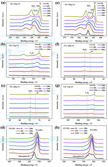 Figure 4 shows the high-resolution XPS spectra of all the elements in passive layers for the NG and CG samples at different sputtering depths. The passive films of both samples have the same composition, including Ti, Al, V, and O. According to the peak strength of Ti 2p3/2, Al 2p3/2, and V 2p3/2 in high-resolution XPS signals, irrespective of grain size, the main component of the passive layer is TiO2 with Ti4+ at 459.1 eV, Ti2O3 with Ti3+ at 457.4 eV, TiO with at 455.1 eV, Al2O3 with Al3+ at 74.3 eV, and V suboxides with neglect content, respectively. It is found that the oxygen content sharply decreases with an increasing sputtering depth in the passive films (Figure 4d,h).