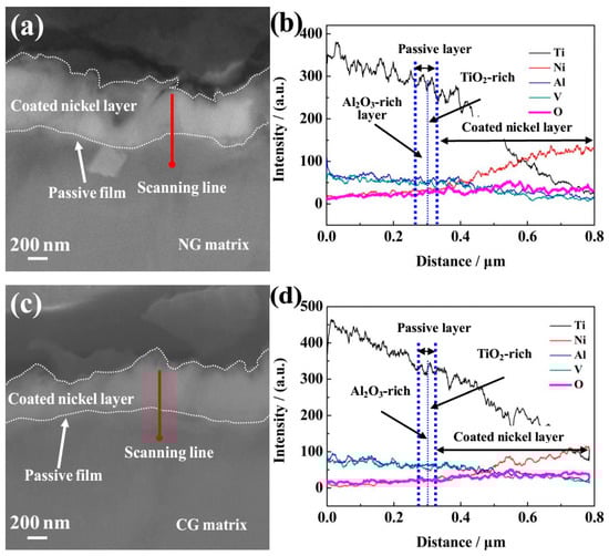 In order to characterize the composition and thickness of the passive film, SEM with EDS analysis was performed. Before the SEM observation, a nickel layer was prepared by the chemistry method and coated on the sample surface to protect the integrality of the passive layer. Figure 5a,c show the cross-sectional SEM morphologies of the formed passive film and nickel layer on the NG and CG Ti–6Al–4V samples after potentiodynamic polarization, and the corresponding composition analysis of the surface layer was analyzed by EDS (Figure 5b,d). It is obviously found that the nickel layers have been successfully coated on the NG and CG surface (Figure 5a,c), and the passive film with the distinct chromatic aberration is located in the interface between the nickel layers and alloy matrix. EDS analysis confirmed that the passive film that formed on the NG surface is much thicker than that on the CG one (Figure 5b,d). The relative content of Ti, Al, and V increased along with the scanning line from the Ti–6Al–4V matrix to the outer nickel layer, but a contrary change was observed for the Ni and O elements.