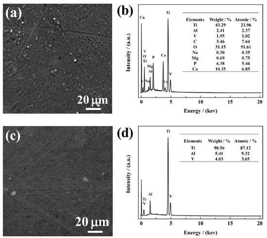 Figure 6a,c show SEM morphologies of NG and CG Ti–6Al–4V surfaces immersed in SBF solution after 240 h, and the corresponding composition of the surface layer was analyzed by the EDS method, as shown in Figure 6b,d. After immersion, it can be observed that a porous apatite layer formed on the NG sample, and a cluster of spherical-like apatite particles were distributed over the entire surface. In contrast, there is no apatite layer/particle retained on the CG surface. In addition, the EDS result reveals that the intensity of the titanium peak is suppressed by the apatite formed on the NG surface, which was attributed to the activated interaction of Ca and P over the NG surface. The formation of the apatite layer is mainly due to the higher hydrophobicity and surface energy of the NG surface, which endows the sample with an enhanced ability to attract more Ca and P ions when compared to its CG form. Therefore, with the interaction between both Ca and P in SBF, a thicker apatite layer will be formed and inevitably improve the corrosion resistance of the NG sample.