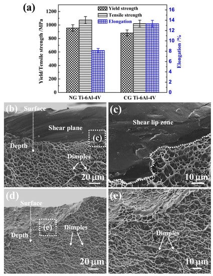 The gradient nanostructed Ti–6Al–4V exhibits improved strength and significantly reduced ductility, which can be attributed to its unique microstructure. The enhanced strength comes from the grain refinement in the surface layer and the unique heterogeneous structure. It has been verified that an additional strength can be achieved in several gradient nanograined materials due to the strain gradient induced between the NG layer and underneath the CG core [,]. In addition, the intrinsic tensile plasticity of the NG surface layer can be inspired as the strain localization is effectively suppressed by the CG core []. So, a moderate elongation can be obtained, which correlated well with the fracture morphologies in Figure 7b–e. The NG Ti–6Al–4V sample presents a large number of dimples and a few cleavage planes in the central crack propagation region (Figure 7b,c), and the edge shear lip region consists of a mixture of shallow and parabolic dimples and shear planes. This appearance of both coarse/parabolic dimples and smooth shear planes indicates the relative poor ductility, which belongs to the mixed fracture of toughness and brittleness. The CG Ti–6Al–4V sample (Figure 7d,e) presents the ductile fracture mode with a large number of dimples in both the propagation and the shear-lip region. Therefore, the NG Ti–6Al–4V alloy possesses an excellent combination of high strength, low modulus, and reasonable ductility for many load-bearing implant and dental applications.