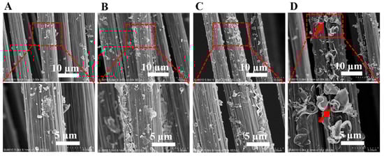 SEM images of fracture surface micrographs of CF-PEEK composites containing CF with different modifications: (A) Desized@CF, (B) PEEK-NH2-1@CF, (C) PEEK-NH2-2@CF, and (D) PEEK-NH2-3@CF.