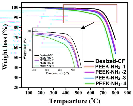 As shown in Figure 4, the initial degradation temperature of desized@CF was about 640 °C [20]. Meanwhile, there was a significant weight loss for CF grafted with PEEK-NH2 which showed two distinct weight losses at 480 °C and 640 °C. It can be seen that with increasing amination degree the thermal degradation continuously increased which was attributed to reactions with the main chain and derivatives of the amino group. This could have affected the level of the improvement, especially at high processing temperature. The results of the thermal analysis for all investigated samples are summarized in Table 3. It is well-known that the amino group of PEEK can form interaction bonds with basic groups in PEEK, thus, leading to the stabilization of the aromatic of the amino group to some extent.