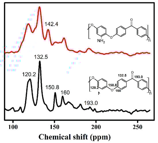 The reaction of the functional polymer with -NO2 was investigated with NMR. The 13C NMR spectrum of PEEK and PEEK-NO2 are given in Figure 5. The polymer backbone of PEEK peaks resonated at 120.2, 132.5, 150.8, 160, and 193 ppm. These peaks shifted to lower chemical shifts in the functional polymer (PEEK-NO2) compared with that of PEEK, and a new peak at 142.4 ppm was observed, which was attributed to the –NO2 grafted onto the PEEK main chain [21].