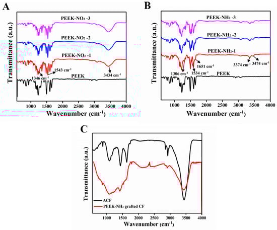 Figure 6A shows the infrared spectra for PEEK and nitrated PEEK with different nitration degrees, and the absorption bands observed at 1543 cm−1, and 1346 cm−1 relate to the unsymmetrical and symmetrical stretching of the nitro group, respectively [21]. The appearance of a band at 3434 cm−1 related to N-H stretching, which increased with the increasing degree of nitration, and the peaks at 928 cm−1 were assigned to C-N stretching. For PEEK-NH2, as shown in Figure 6B, the peaks at 3474 cm−1, 3374 cm−1, and 1651 cm−1 were attributed to N-H stretching, the peak at 1306.3 cm−1 was attributed to C-N stretching, and the peak at 1534 cm−1 was attributed to N=N stretching and the intensity of this group increased with amination degree increases [22]. All these changes indicated that the nitro groups were reduced to amino groups. For activated CFs (Figure 6C), peaks observed at 3439 cm−1, 1753 cm−1, and 1118 cm−1 were associated with stretching vibrations of -OH groups, C=O groups, and -COOH groups, respectively. For the PEEK-NH2 grafted CFs, the disappearance of the peak located at 1710 cm−1 verified the alteration of the molecular structure of the carboxylic acid group [23]. The peak at 1531 cm−1 corresponded to the bending vibration of the N–H of amide, indicating that PEEK-NH2 was grafted onto the fiber surface through covalent bonds [24].