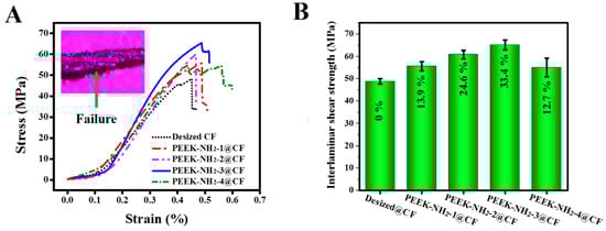 (A) Stress–strain curves in interlaminar shear strength (ILSS) tests, (B) ILSS at different degrees of amination of PEEK.
