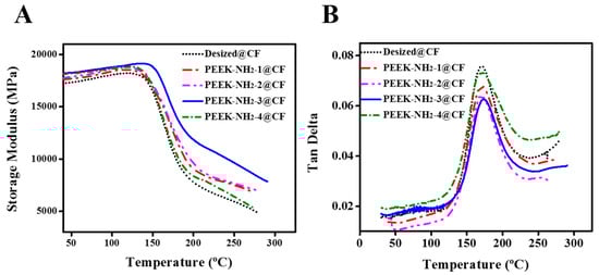 (A) Storage modulus and (B) tan δ of PEEK-NH2 modified CF/PEEK composites.