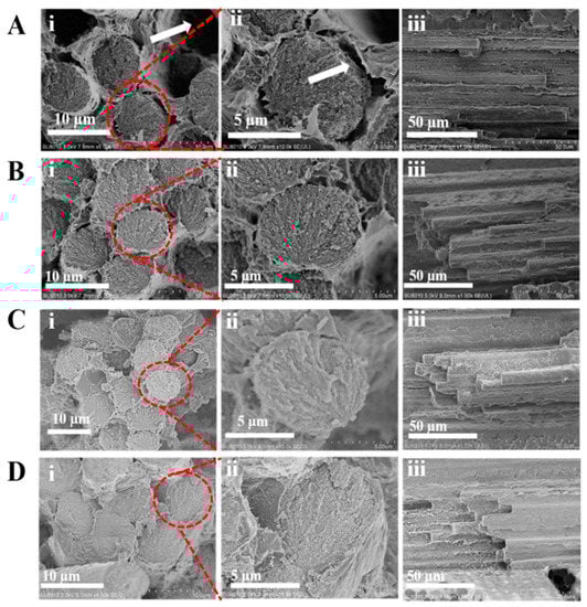 The pulled out CF and the big crack in the interface of the desized CF/PEEK composite were observed (see arrows in Figure 9Ai,ii). As shown in Figure 9Aiii, the debonding failure surfaces presented a little matrix attached to the CF surface. These results indicated a poor interface between CF and PEEK. The surface morphologies of PEEK-NH2-1@CF are shown in Figure 9Bi,ii. The pulled out CFs in the modified CF/PEEK composite were not observed but a small crack was deflected. As shown in Figure 9Biii, some PEEK resin detached from the CFs surface owing to the relatively weak adhesion between CFs and PEEK resin. For PEEK-NH2-2@CF, the crack was reduced and there was no gap between CF and the matrix (Figure 9Ci,ii). Furthermore, as shown in Figure 9Ciii, more PEEK resin was attached in CFs compared with PEEK-NH2-1@CF, which indicated that the interface improved to some extent. For PEEK-NH2-3@CF, it suggested that the fiber was broken together with the matrix during the fracture, which further substantiates adhesion between PEEK and CF (Figure 9Di,ii). Besides; it is found that more resins completely adhered on the surface of PEEK-NH2-3@CF (Figure 9Diii). It can be inferred that the interfacial properties of PEEK-NH2-3@CF composites were improved with the increased degree of amination, which is in good agreement with previous experimental results of ILSS. The improvement can be attributed to the chemical bond between PEEK-NH2 and COOH in CF, thus, building an interfacial layer on the surface of CF while improving wettability with the PEEK matrix. Meanwhile, the compatibilizer also had good compatibility with the PEEK matrix.
