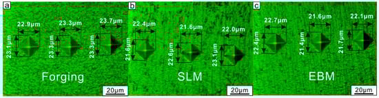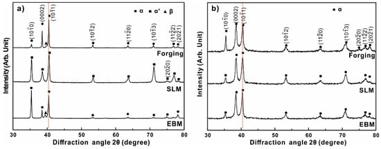 It is worth noting that some XRD peaks of the SLM and EBM samples are slightly shifted from the originally expected 2θ positions, and broadened compared to the forged sample. Among the three XRD patterns, the SLM pattern shows the widest peaks, which may be due to the presence of nano-crystalline phases obtained from high cooling rates during solidification or due to the presence of a high degree of internal stresses [].