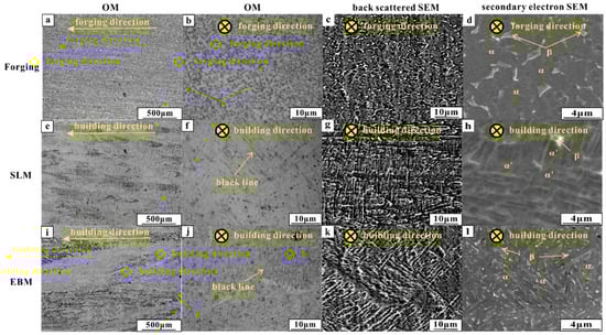 OM, back scattered SEM and secondary electron SEM images of samples produced by (a–d) forging; (e–h) SLM; (i–l) EBM.