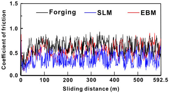 The coefficient of friction (COF) as a function of sliding distance for Ti-6Al-4V samples is shown in Figure 4. The SLM sample showed the lowest COF, which is 0.4 ± 0.2, the EBM sample had a COF of 0.5 ± 0.1 and the forged sample had the highest COF of 0.6 ± 0.3. The higher the COF, the worse the wear of the property will be. Similarly, in the present case, the forged sample exhibited the highest COF and, hence, the worst wear property amongst the forged, SLM and EBM samples. The COF was determined in relation to the alloying element and composition of the alloy. This caused a difference in the microstructure, hardness and strength in the alloy, thereby affecting its COF [,,].