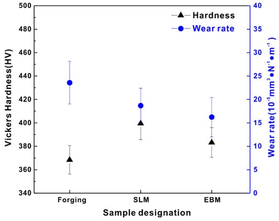 Hardness and wear rate of Ti-6Al-4V samples fabricated by forging, SLM and EBM.