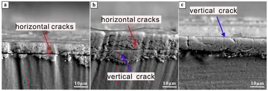 Based on the above results, it can be observed that the SLM and EBM Ti-6Al-4V samples showed predominantly similar wear mechanisms. An abrasive wear due to the loading from the GCr15 ring and tribo-layer was due to plastic deformation and oxidation. The SLM and EBM samples showed better wear resistance than the forged sample. This result can be correlated to the higher hardness and weaker delamination tendency in the sub-surface of the SLM and EBM samples during the wear tests. Moreover, the SLM and EBM samples exhibited higher hardness than the forged sample, which can be ascribed to the presence of fine microstructure and martensitic phase (as seen in Figure 3). Severe delamination of the tribo-layer was developed in the forged sample due to the formation of the primary crack during the cycling loading, leading to significant material removal (as seen in Figure 7b), which is in accordance with other reported works [,,,]. Unlike the forged sample, the SLM and EBM samples showed more uniformly distributed cracks, which can avoid the formation of primary cracks.