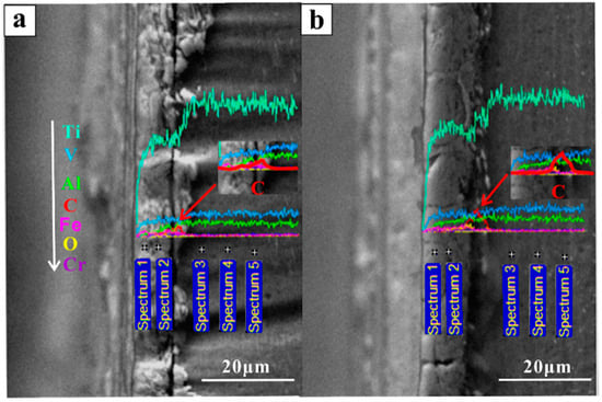 Energy dispersive spectroscopy (EDS) lines and points analysis of tribo-layer of the cross-sections of the (a) forged, (b) EBM samples.