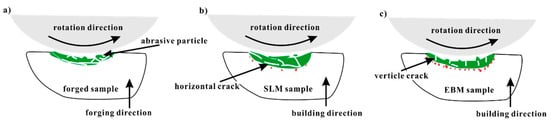 A schematic illustration of the different wear behavior in Ti-6Al-4V produced by the different processes is shown in Figure 10. The tribo-layer and the cracks were highlighted in the figures, which are the most important facts affecting the wear resistance of the forged, SLM and EBM samples. Most of the cracks propagated horizontally in the SLM samples, which could lead to delamination during the continuous wear loading. Meanwhile, most of the cracks propagated vertically in the EBM samples, giving them better resistance than the SLM samples. The main reason for the crack propagation behavior resulted from the different microstructure, in which a more brittle martensitic phase existed in the SLM sample.