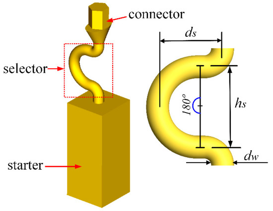 To achieve high-efficiency grain selectors for growing SX blades, several kinds of grain selectors such as restrictor, angled and spiral selectors were designed in the past few years [14]. However, the restrictor selector was less efficient because a longer length for selecting a single grain is needed [15]. Around the corners of the angled selector, new grains often nucleate due to the sudden change in growth direction [16,17]. In the wax injection stage, the spiral selector cannot be integrally fabricated coupled with the blades, because of the complex, three-dimensional (3D) shape of the spiral. It needs to be welded with the blades, which results in inevitably some position error and sudden failure in the grain selection. A high stability of the spiral selector cannot be kept, although it has been employed in casting foundries.