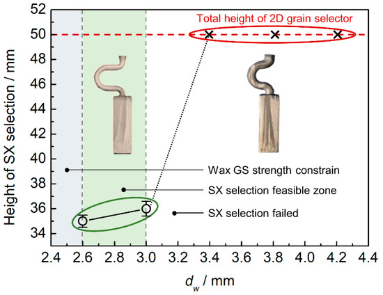 Figure 4 shows the effect of the selector thickness on grain selection. The eccentric distance is kept as 8 mm. It can be seen that with increasing selector thickness to from 2.6 mm to 3 mm, a single crystal can be selected and the height where the SX structure occurs is reduced gradually. However, the SX selection failed when the thickness is larger than 3 mm. Also considering the stability of the 2D selector, the thickness of 3 mm is recommended.