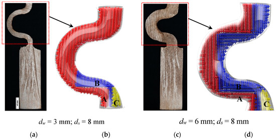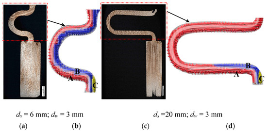 Previous investigations [16,20] suggests that grain selection in the selector part arose from the dendrite competitive growth and geometrical blocking mechanism. As shown in Figure 5a,b, three grains entered into the selector part of the 2D selectors with 3 mm and 6 mm diameters. The orientation of grain B is well aligned with the vertical thermal gradient, whereas the orientations of grains A and C are a little misaligned. At the beginning of solidification, the dendrite tips of grain B can grow ahead of grains A and C because of the lower undercooling demanded at the dendrite tips for grain B [19]. The grain C is surpassed by grain B since its primary tips impinge not only on the mold wall but also on the dendrite trunks of grain B. Although grain B grows ahead, it is finally surpassed by grain A. The first reason for this occurrence is that the primary and tertiary dendrite arms of grain B are blocked by the selector wall. The second reason is that the growing velocity of the secondary dendrite arms that develops from the primary dendrite arms of grain B is slower than for grain A, because of the fine cooling condition and higher undercooling on the side facing the heater [21]. The tertiary dendrite arms of grain A blocks the growth of those of grain B. As a result, only grain A survives and grows into the castings. Figure 5c,d demonstrate the case when the selector thickness is increased. In this case, the grain B has enough available space for growing dendrites, which overcomes the shortage of the dendrite growing velocity. Therefore, both grain B and grain A can grow into the castings.