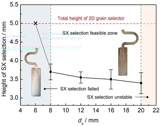 Figure 6 illustrates the effect of eccentric distance on grain selection. The selector thickness is held constant as 3 mm. It is found that the SX can be successfully selected when the eccentric distance (ds) is larger than 8 mm. The selecting height is reducing with an increasing eccentric distance. This indicates that the selecting efficiency of the 2D selectors is improved with increasing eccentric distance. However, when the eccentric distance is larger than 20 mm, the structural instability occurs. The wax 2D selectors are easy to break when they are assembled with castings to a mold cluster. Considering the stability of the 2D selector, the eccentric distance of 8 mm is recommended.