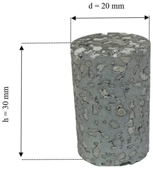 The alloy used for the metallic matrix of the manufactured syntactic foams was ZA27. According to ASTM B86-13 [] this zinc alloy contains 27 wt.% aluminum and 2 wt.% copper as main alloying elements and its melting range is considered to be between 375 and 487 °C. The density and die shrinkage of this alloy are reported to be 5.00 g·cm−3 and 13.00 mm·m−1 respectively []. The size of expanded perlite (EP) particles was filtered using a vibrating sieve shaker. Particles trapped between meshes of spacing of 2 and 2.8 mm were collected for sample manufacturing. The EP particles were supplied by Australian Perlite Pty. According to the supplier information, the chemical composition of the EP particles is 75 wt.% SiO2, 14 wt.% Al2O3, 3 wt.% Na2O, 4 wt.% K2O, 1.3 wt.% CaO, 1 wt.% Fe2O3, 0.3 wt.% MgO, 0.2 wt.% TiO2 with traces of heavy metals []. Their particle and bulk densities are 0.16 g·cm−3 () and 0.091 g·cm−3 () []. Counter-gravity infiltration casting was used to manufacture cylindrical syntactic foam samples (see Figure 1) with a diameter of 20 ± 0.25 mm and 30 ± 0.2 mm height. This technique was also employed to manufacture aluminum alloy syntactic foams []. The method allows producing syntactic foam samples with similar densities and a uniform distribution of filler particles []. Therefore, it can be considered to be a repeatable production technique. In the first step, a stainless steel mesh was placed in the closed end of a graphite mold. Then, the mold was filled with four equally sized batches of expanded perlite particles. The resulting packed particle bed was compacted via vibration following the addition of each batch. To this end, the mold was gently tapped by hand for 20 s to ensure a homogeneous distribution of particles. The compaction aims to minimize the density gradient along the sample height. As a result, more homogenous material properties are achieved, and the overall foam density is decreased []. Another stainless steel mesh was placed on the open end of the mold to fix the particles in place. A solid block of ZA27 alloy was then inserted into a graphite crucible. The filled mold was inserted upside-down into the same crucible leaving only a tight gap to permit relative motion. In the next step, the assembly was moved inside a resistance furnace and heated to 535 °C (above the melting temperature of ZA27) for 30 min. After melting, the assembly was removed from the furnace and casting was immediately initiated by positioning a 1 kg weight on top of the mold, forcing it into the crucible. After cooling the samples under atmospheric conditions, they were manually removed from the mold. Finally, the stainless steel meshes were machined from the cast samples.