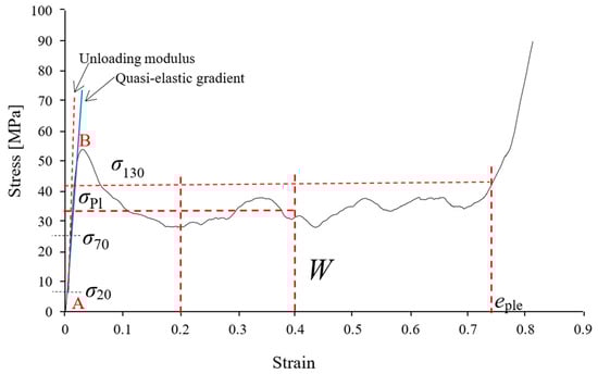 Figure 2 shows a typical engineering stress-strain curve of a metallic foam and selected mechanical properties defined in the ISO13314 standard []. At small strains, a linear stress increase is visible which is followed by a stress peak. The slope of the linear section is the quasi-elastic gradient which is used to determine the 1% offset yield stress, i.e., the compressive stress at a plastic strain of 1%. Following the peak stress, the stress decreases towards a plateau region quantified by the plateau stress . This plateau stress () is the arithmetic mean of the stress between 20% and 40% compressive strain. The plateau end stress is defined as 1.3 times the plateau stress and its corresponding strain is named the plateau end strain . The energy absorption W of the syntactic foam samples was obtained by integration of the stress-strain data up to 50% strain: