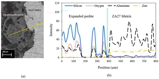 (a) SEM image of the interface between expanded perlite particle and ZA27 matrix. (b) Energy dispersive spectroscopy (EDS) line scan along the arrow in (a).