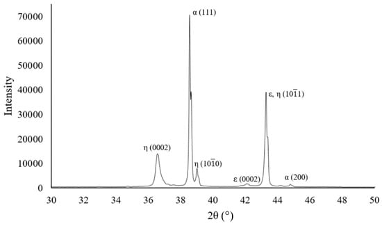 Figure 3a shows an SEM image of the interface between the ZA27 matrix and an expanded perlite particle. In order to analyze the elemental distribution, an EDS line scan was performed along the shown arrow. The corresponding intensity profile in Figure 3b indicates silicon, oxygen and aluminum as the dominant elements along the expanded perlite section. The presence of aluminum in the expanded perlite section can be explained by Al2O3 being part of the chemical composition of the particles. As expected, mainly zinc and aluminum are detected within the ZA27 matrix. Figure 4 shows the XRD analysis of the as-cast solid ZA27 alloy. The XRD pattern of the as-cast matrix is shown in Figure 4. The (111) and (200) peaks of α, (0002), (100) and (101) of η, (0002) and (101) of ε phases were detected. The intensity peaks for aluminum (see Figure 3) in the ZA27 matrix section likely indicate aluminum rich dendritic phases in the microstructure of the as-cast ZA27 alloy (see Figure 5). The EDS line scan further confirms the lack of any chemical reaction between the ceramic particles and the metallic matrix. The low intensity peaks of silicon and oxygen in the ZA27 matrix section are most likely due to perlite fragments that were deposited during sample polishing. Expanded perlite particle is composed of various oxides [] that are unlikely to react with any constituents of the ZA27 alloy at a casting temperature of 535 °C. This result is in agreement with a previous study on syntactic foams containing EP particles within an A356 aluminum matrix [].