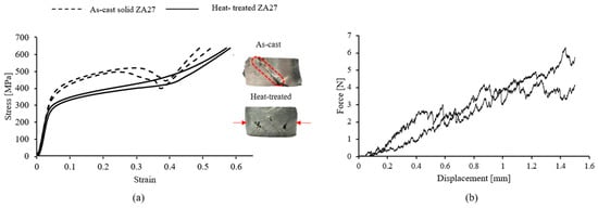 Two as-cast and heat-treated solid samples each were tested under uni-axial compression. The resulting engineering stress-strain curves are shown in Figure 6a. Brittle deformation was observed for the as-cast solid alloy with signs of macroscopic shear bands (dashed lines in Figure 6) at approximately 45° relative to the loading direction. In contrast, the heat-treated solid samples show a much more ductile deformation with pronounced barreling during compression (see arrows). Moreover, surface cracks are visible on the heat-treated sample, likely due to tensile stresses associated with the barreling. Thermal treatment decreased the proof stress from about 360 MPa (as-cast) to 280 MPa (heat-treated). At higher strains, a stress drop occurs in the as-cast samples. The stress drop commences at similar strains for both as-cast samples and coincides with the first occurrence of macroscopic shear bands. The findings of [] could be confirmed, i.e., the applied heat treatment alters the deformation mechanism of the ZA 27 solid alloy from brittle to more ductile.