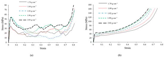Compressive stress-strain curves of (a) as-cast and (b) heat-treated ZA27 syntactic foams with different densities.
