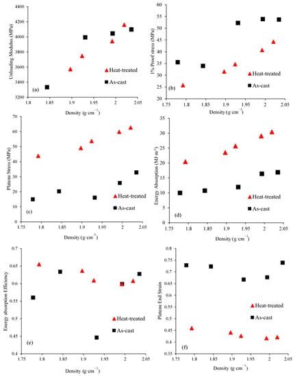 Selected mechanical properties of ZA27 syntactic foam are shown in Figure 8 for both as-cast and heat-treated samples. The majority of mechanical properties increase with foam density. The exceptions to this trend are the energy absorption efficiency and the plateau end strain. A similar behavior was previously observed for aluminum-expanded perlite syntactic foams [].