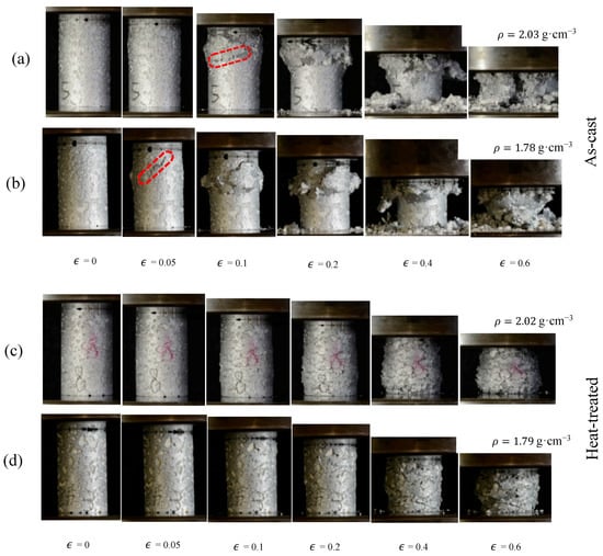 Deformation mechanism of (a,b) as-cast foams with densities of 2.03 and 1.78 g·cm−3 respectively. (c,d) heat-treated foams with densities of 2.02 and 1.79 g·cm−3 respectively.