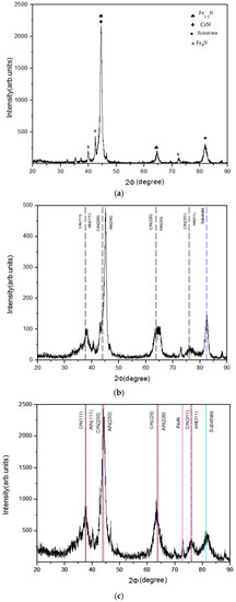 The nitrided layer is usually composed of the compound layer and the diffusion layer. The compound zone mainly consists of porous ε-nitrides, whereas the diffusion layer is nitric martensite [23,24]. Duplex treatments combine PN with the subsequent deposition of hard coatings to create good tribological properties. In this study, samples of plasma nitrided SKH9 steel, AlCrSiN-coated sample, and PN + AlCrSiN (with PN pretreatment) coated SKH9 steel were tested for research. Figure 2 shows typical X-ray diffraction (XRD) patterns of plasma nitrided (PN), AlCrSiN-coated, and PN + AlCrSiN-coated samples. After plasma nitriding, it can be seen that the XRD patterns of the nitrided compound layer consists of diffraction peaks of CrN, FexN, where x = 2–3, and Fe4N, as shown in Figure 2a. The substrate α′-martensite peak at 82.4° was detected in the PN-treated layer, and it suggested that the nitrided layer was thin and less than the X-ray penetration depth, and resulted in observing the substrate α′-martensite phase. The main nitride precipitates that were identified were Fe2–3N and Fe4N. These precipitates play the main role in increasing the surface hardness and improving the wear resistance, thereby, increasing the time of fatigue fracture [25]. For the AlCrSiN, when N2 was introduced during the coating process, the Al, Cr, and Si plasma generated by arc evaporators induced the excitation of N2 to form AlCrSiN on the substrate. Figure 2b shows the XRD pattern of the AlCrSiN without plasma nitriding treatment. Regardless of the low Si content (less than 10 at.%), the sequence of crystalline phases was observed, and no corresponding peaks of crystalline silicon nitride were found. The crystallography structure of single-phase face-centered cubic (FCC) AlCrN solid solution was detected. The four main peaks correspond to reflections (111), (200), (220), and (311) consisting of nanocrystalline FCC-AlCrN [26,27,28]. Figure 2c shows the diffraction pattern of PN + AlCrSiN consisting of AlCrN and Fe4N phases. The Fe4N compound layer was obtained during the nitriding process. The compound layer led to higher hardness and improved the adhesion quality of coatings. Similar to the previous AlCrSiN without plasma nitriding, the AlCr(Si)N phases exhibited cubic B1-NaCl structure. The lattice structure of the deposited coatings showed solid solution in these coatings. The lattice parameter of the AlCrSiN was 0.424 nm, which was between the values of cubic AlN (JCPDF file No.: #251495) and CrN (JCPDF file No.: #110065). The microstructure was obtained by the formation of an FCC phase, obtained by the substitution of Al and Si in the cubic CrN phase. The Si-containing AlCrSiN coatings had better oxidation and tribological resistances than CrN and CrAlN and possessed good mechanical properties [14,29,30].