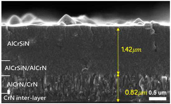 In order to study the microstructure of coating construction, Figure 3 shows the fractured cross-sectional SEM image of the AlCrSiN coating on an Si (100) wafer. Deposited at a high bias voltage of −120 V, the top AlCrSiN layer showed fine dense structures. CrN and AlCrN/CrN bottom interlayers showed obvious columnar structure. After AlCrSiN was co-deposited with AlCrN, the formation of the columnar structure was reduced. The deposited AlCrSiN with a transition layer of AlCrSiN/AlCrN possessed a much denser structure because of the presence of Al and Si to form compact nanocrystalline structures. Similar results by He et al. [31] also showed that the single-phase cubic CrAlN coatings exhibited a columnar structure, while dense and featureless characteristic morphologies for AlCrSiN coatings were observed. The total thickness of the graded AlCrSiN coating was 2.24 μm, which was similar to the result of Calotest (~2 μm), and consisted of the top AlCrSiN layer, transition layer of AlCrSiN/AlCrN, and columnar AlCrN/CrN interlayers. From the EDS measurement, the chemical composition of the deposited AlCrSiN top layer coating was 26.7 at.% Al, 17.6 at.% Cr, 4.2 at.% Si, and 51.5 at.% N. It showed atomic stoichiometries of Al0.55Cr0.37Si0.08N for the deposited AlCrSiN. Distinct interfaces were observed at the boundaries between the transition layer (AlCrSiN/AlCrN) and the columnar AlCrN/CrN interlayers. In this AlCrSiN, the addition of Si impeded grain growth and led to grain re-nucleation, and. Therefore. resulted in a compact and dense structure. The retardation of columnar growth by the incorporation of Si in the CrAlN coating was proved, and previous studies demonstrated that the overall oxidation resistance of the AlCrSiN coatings after Si doping was significantly improved at high temperature [32,33,34].