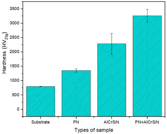 High surface hardness of the tool steels can increase capacities of load support and high abrasion wear resistance. In this study, the measurement was performed using a Vickers microhardness tester. The applied load on the specimen was 25 gf. Figure 4 shows the hardness of SKH9 high-speed steel substrate, PN-treated, AlCrSiN-coated, and PN + AlCrSiN-coated samples under different processes. The hardness for PN samples was 1352 HV25g, which was higher than that of SKH9 high-speed steel. From the results, the PN + AlCrSiN possessed hardness of about 3256 HV25g, which was the highest hardness among all the samples, and the AlCrSiN-coated samples (without PN pretreatment) possessed lower hardness, i.e., 2285 HV25g, than PN + AlCrSiN. The hardness of the PN + AlCrSiN-coated samples was 2.4 times higher than that of the PN-treated SKH9. In this case, it revealed that the AlCrSiN-coated sample with PN pretreatment could achieve the highest hardness among the samples. The duplex treatment combining PN and hard coating exhibited higher hardness as compared to non-duplex-treated samples. The nitrided layer was helpful for the progressive hardness distribution, inducing the gradual transition of mechanical properties improving the wear resistance [35,36].