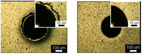 The adhesion strength of all the PN, AlCrSiN-, and PN + AlCrSiN-coated samples was investigated using the Rockwell indentation test. This destructive test, may exhibit two distinctive properties of the coated compound [37,38]. We used Rockwell indentation with a load of 150 kg based on the ISO 26443 standard to evaluate the adhesion strength of the coatings. According to the criteria, class 0 reveals acceptable adhesion. Class 1 shows no adhesive delamination; adhesion is acceptable. In the cases of class 2 and class 3, adhesion is unacceptable [39]. Adhesive delamination is defined as a removal of the coating, whereby the underlying substrate can be clearly seen, or a removal of one or more sublayers in a multilayered or graded coating, whereby the substrate or an underlying sublayer can be clearly distinguished. Figure 5 shows optical images to reveal the crack behavior of the AlCrSiN- and PN + AlCrSiN-coated samples. The optical image with high magnification shows the crack condition on the edge of the indented crater. The AlCrSiN coating (without PN) showed that, initially, circumferential cone cracks developed beneath the indenter, followed by radial and annular cracks as well as some coating spallation, which appeared at the edge of the indenter crater. The poor adhesion of class 2 is recognized on contrast. The coating was too stiff to buckle, which created the formation of compressive stress cracks at the wear interface of the coating and the specimen. These compressive stress-induced cracks propagated, and the formation of spallation in coatings occurred. This kind of adhesion failure was usually observed in brittle ceramic coatings with weak interfacial adhesion to the specimen. The plastic deformation easily took place due to its low hardness, resulting in the cracks formed in the indentation edge. If the interfacial adhesion of coatings was large in area, lesser wedge spallation occurred on the substrate coatings.