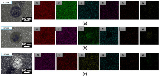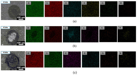 SEM and energy-dispersive X-ray spectroscopy (EDS) element mapping of AlCrSiN-coated samples at room temperature after (a) 200k, (b) 300k, and (c) 400k impacts.