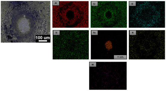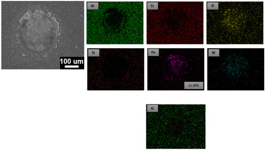The high-temperature fatigue impact test at 500 °C was performed on the AlCrSiN-coated high-speed SKH9 steel. The SEM image with EDS element mapping image is shown in Figure 8. The elemental mappings of aluminum (Al), chromium (Cr), silicon (Si), tungsten (W), oxygen (O), iron (Fe), and nitrogen (N) signals are shown. It showed that the surface was exposed of iron signal from the substrate of the AlCrSiN-coated SKH9 steel. Therefore the substrate was exposed to 200k impacts at the high temperature of 500 °C. On the other hand, a high-temperature impact of PN + AlCrSiN after 200k impacts was conducted. As shown in Figure 9, no iron (Fe) signal was present on the impacted surface. The duplex-treated sample (PN + AlCrSiN) had the presence of an Fe–N compound and a diffusion layer beneath the hard AlCrSiN coating. These two layers supported the top AlCrSiN layer from heavy mechanical loads at high temperature, which also improved the hardness and adhesion strength to the tool steel. The surface modification of SKH9 steels by a combination of plasma nitriding and coatings resulted in excellent mechanical load bearing capacity and strong adhesion at high temperature. Compared to the non-duplex-treated AlCrSiN sample that only resists 200k impacts at high temperature, duplex-treated AlCrSiN coatings had better performance of periodic impact fatigue resistance at high temperature.