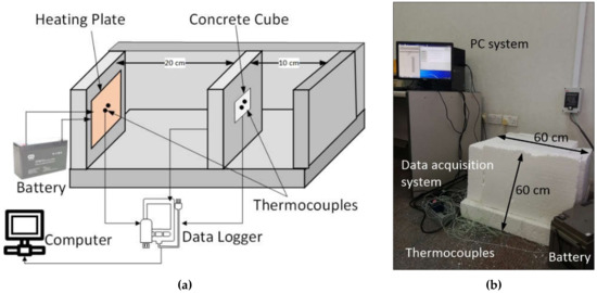 An enclosure 400 × 400 × 400 mm (as inner space) in size was designed to mimic an indoor setup employing 100 mm thick expanded polystyrene sheet. The polystyrene sheets were joined using insulating epoxy to prevent air infiltration from all but one side. The top side was kept operable to install measuring sensors and replace samples. An 80-Watt silicon heating mat, being 400 × 200 mm2, affixed to a 50 mm thick wooden sheet of the same dimensions, was used to supply heat to the setup. Samples were placed at calibrated distances of 220 mm from the heat source to represent certain heat loads. The heating setup was powered by a 12V, 150 Ah, rechargeable battery. A stable power output was maintained from the battery to assure consistent heat load on the sample during each set of experiments. Figure 3 shows a schematic diagram and photo of the experimental setup.