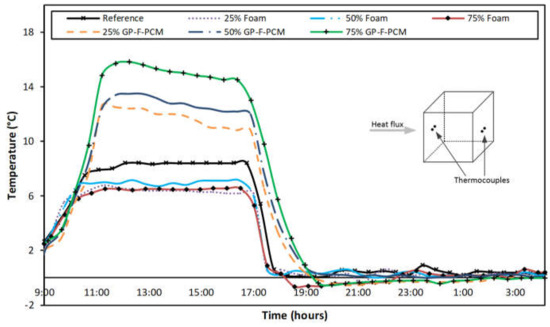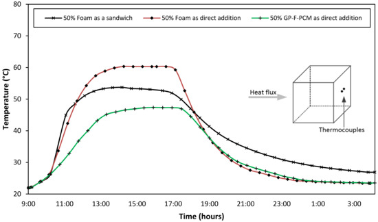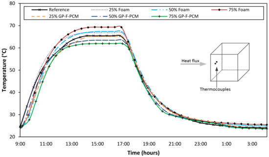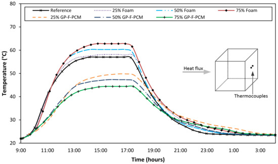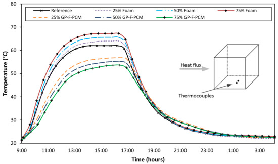 Figure 8 shows the temperature profile obtained from the sensors attached to one side of the cubes. Temperature behavior is again like the front and the back surface, but the values of these are in between the two. Steady state of the temperature curves was achieved at 67.2 °C, 62.0 °C, and 53.6 °C for the 75% foam, reference, and 75% GP-F-PCM capsules, respectively.