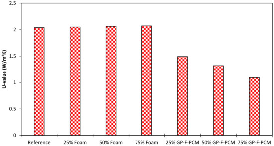 Figure 9 represents the results of U-value for all geopolymer concrete compositions. The software provided by green TEG integrates the measured data over the entire time domain and gives a single U-value based on Equation (1). The highest value of 2.07 W/m2K is observed for 75% foam (even greater than the reference value of 2.04 W/m2K), which may be attributed to increased thermal conductivity due to the reaction of the foam with the alkali. Another reason could be the increase in density of the geopolymer reaction products, because it also increased the structural strength, as described in the compressive results section. With the inclusion of GP-F-PCM, the insulation effect of the material is improved. In comparison to the reference, U-values decreased by 27%, 35%, and 47% with the addition of GP-F-PCM in proportions of 25%, 50%, and 75%, respectively.