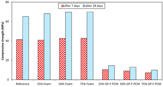 Figure 10 shows the compressive strength of GPC after seven and 28 days with different amounts of foam and GP-F-PCM. The compressive strength was 41.5 MPa and 65.7 MPa for the reference case after seven and 28 days, respectively. The strength was like the reference cube in the case of addition of foam, where it ranged from 40.9 MPa to 42.8 MPa at the age of seven days and 68.1 MPa to 69.9 MPa at the age of 28 days. Compressive strength dropped with the inclusion of GP-F-PCM capsules, which ranged from 7.2 MPa to 10.4 MPa after seven days and 9.9 MPa to 14.6 MPa after 28 days. Comparing the composite concrete of foam with the reference cube, specimens with foam exhibited slightly more strength, which may be attributed to more compaction. In the case of GP-F-PCM, more fragile areas are developed due to the presence of PCM capsules [40]. Cui et al. pointed out the low shear strength and stiffness of PCM capsules responsible for the loss of compressive strength [42]. Results of the previous studies reported that the addition of PCM capsules induced porosity into GPC [37]. This porosity is linked with the reduction in compressive strength [37]. Other researchers stated that PCM adversely affected the geopolymerization process of FA, which caused a reduction in compressive strength [39].
