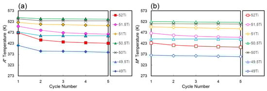 - Khan, I.M.; Kim, H.Y.; Nam, T.H.; Miyazaki, S. Effect of Cu addition on the high temperature shape memory properties of Ti50Ni25Pd25 alloy. J. Alloys Compd. 2013, 577, S383–S387. [Google Scholar] [CrossRef]