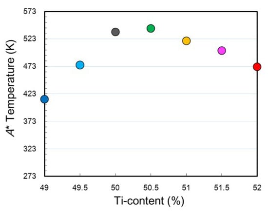 - The Ti content of the matrix region increases linearly while the Ni content of the matrix region decreases with increasing the nominal Ti content. The martensitic transformation temperature shows the highest value when the Ti content in the matrix is near the stoichiometric composition and it decreases with increasing or decreasing the Ti content as compared to the stoichiometric composition.