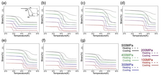 - Bigelow, G.S.; Garg, A.; Padula, S.A., II; Gaydosh, D.J.; Noebe, R.D. Load-biased shape memory and superelastic properties of a precipitation strengthened high temperature Ni50.3Ti29.7Hf20 alloy. Scr. Mater. 2011, 64, 725–728. [Google Scholar] [CrossRef]