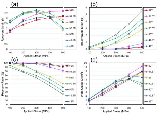- Both Ti-rich and Ti-lean alloys exhibit excellent dimensional stabilities, higher recovery ratio and larger work output during thermal cycling under constant stresses when compared with the alloys with near-stoichiometric composition.