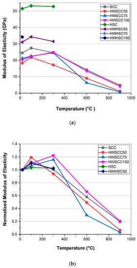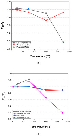 In which and are the residual compressive strength and modulus of elasticity, and and are the compressive strength and modulus of elasticity at ambient temperature, respectively.