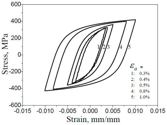 The tensile and compressive cycle test was carried out at room temperature by a MTS809 fatigue testing machine. The experiment was controlled by a constant strain amplitude sine wave with frequency of 1 Hz. The relative total strain rate variation range of this paper was 0.012–0.04 s−1 (with respect to the strain amplitude range 0.003–0.01). Both comply with the regulations of ASTM-E468-90 (2004). The mathematical expectation of the fatigue life of the material measured at the specified strain amplitude, , was denoted as , and the fatigue tests with the strain amplitudes of 0.003, 0.004, 0.005, 0.008, and 0.01 were conducted. At least 3 specimens were used in each strain amplitude test, and the fatigue life value of an individual specimen was denoted as , and its average was , see Table 3. Then, referring to Table 3, three pre-fatigue loading conditions ( values of 33.3%, 50%, and 75%, respectively, is the number of cycles) were conducted for five strain amplitudes, as shown in Table 4. All steady hysteresis loops at various strain amplitudes in the tests are shown in Figure 2. During cycles, there was no obvious cyclic hardening and softening.