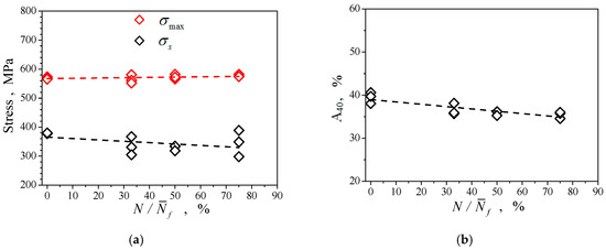 The yield strength, tensile strength, and working section (40 mm) elongation determined are plotted in curves in Figure 4. The figure shows that the yield strength of the material, denoted by , with the increase of , does not change much but disperses significantly. This indicator does not seem like an easy method for evaluating the remaining life of the specimens. The test of the residual strength of the specimens subjected to pre-fatigue at different strain amplitudes with different consumed relative life values (equivalent to the number of pre-fatigue cycles performed) was carried out by placing them under tension until they fractured, and the residual strength was obtained from the record of tested maximum loads and is expressed in the figure by . The results with respect to different relative life consumption (Figure 4a) were similar to that of Q235 steel and austenitic stainless steel [30,32]. Some researchers believe that the accumulation of fatigue damage in materials will reduce the tensile strength of the material, and attempt to establish a relationship between the remaining life and residual strength on this basis [33]. But the results of Figure 4a show that the increase in the accumulation of damage experienced by the material does not necessarily lead to a decrease in the residual strength, and the remaining life of the material cannot be inferred from the residual strength. Let us examine the ratio of elongation (residual ductility) of the working section (with an initial length of 40 mm) after pre-fatigue indicated by A40. It can be seen from Figure 4b that the elongation of the specimens after the cycle had a tendency to decrease as the number of pre-cycles increased. However, the range of variation was fairly small, so it was not suitable to be an indicator for assessing the remaining life of the specimens.