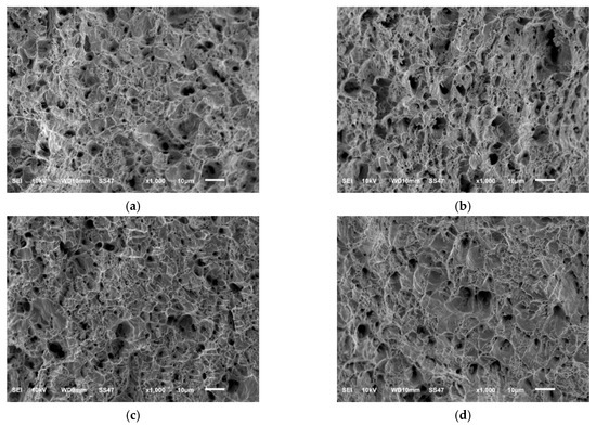 Scanning electron microscope (SEM) fracture images of specimens fractured by uniaxial tension after pre-cycles. (a) = 0%; (b) = 33.3%; (c) = 50%; (d) = 75%.