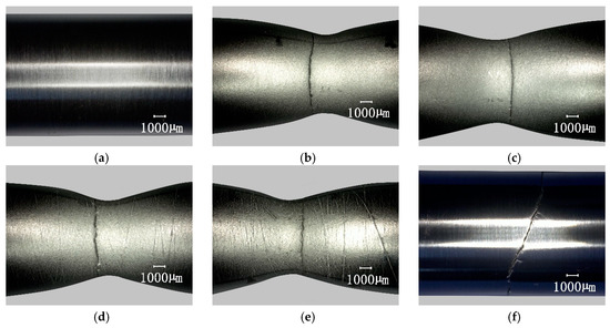 After having undergone different pre-fatigue cycles, the specimen surface under the optical microscope was still smooth, and it was difficult to observe the difference caused by different fatigue cycles. However, after uniaxially stretching to break, the difference in crack distribution associated with the number of cycles could be observed by the naked eye on the surface of the neck portion of the specimens. Figure 6 shows the appearance of specimens subjected to different pre-fatigue cycles at a constant strain amplitude of 0.005. The test results at other strain amplitudes are not shown due to page limitations, but they are similar. Figure 6a shows the smooth surface of the original specimen. Figure 6b shows the specimen which was directly subjected to uniaxial tension until fracture without pre-fatigue, and the surface was rough compared to the original, but no crack was found on the surface. Figure 6c–e are specimens with pre-cycle of 33.3%, 50%, and 75%, respectively. They had obvious rough bands and micro-cracks on the neck surface, and the larger the number of fatigue cycles, the more obvious the rough bands and micro-cracks. As mentioned earlier (Section 1), micro-cracks are the micro-rupture appearance on the shallow surface of the specimen caused by large deformation stretching, which reveals accumulated distributed fatigue damage. This is most likely related to some initial processing of micro-structures on the surface or subsurface of the material. During cyclic loading, the damage gradually evolves on these structures and deepens. At last, it is revealed by large deformation stretching. Figure 6f is the specimen which was fractured by fatigue, and the surface still looked smooth. These results were similar to those of the Q235 steel test [30].